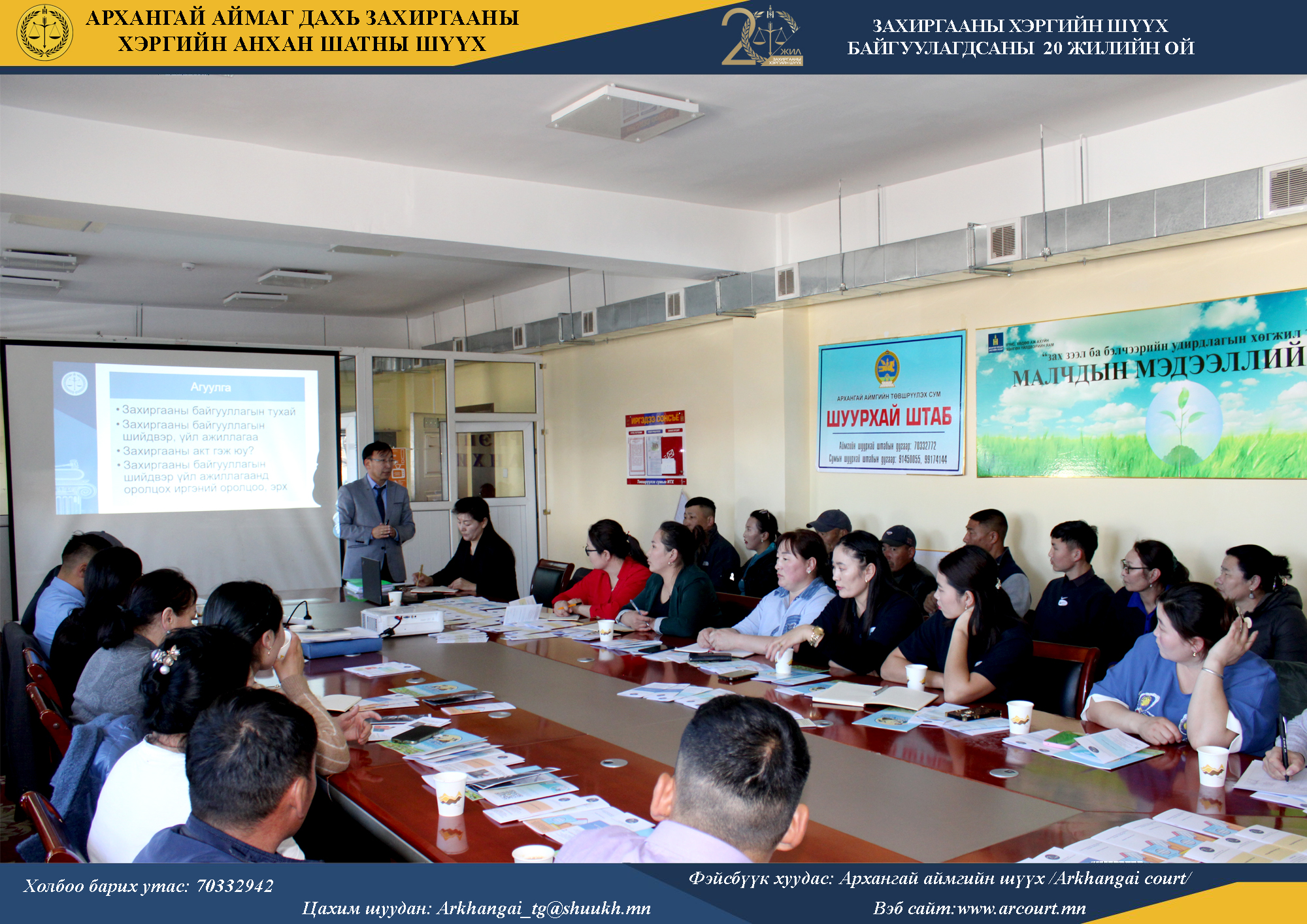 “Иргэний шүүхэд мэдүүлэх эрх, иргэний хэргийн шүүхээр түгээмэл шийдвэрлэгддэг хэрэг, маргаан анхаарах зүйл” сэдвийн хүрээнд Архангай аймгийн сум дундын иргэний хэргийн анхан шатны шүүхийн Ерөнхий шүүгчийн туслах Э.Энххүү;