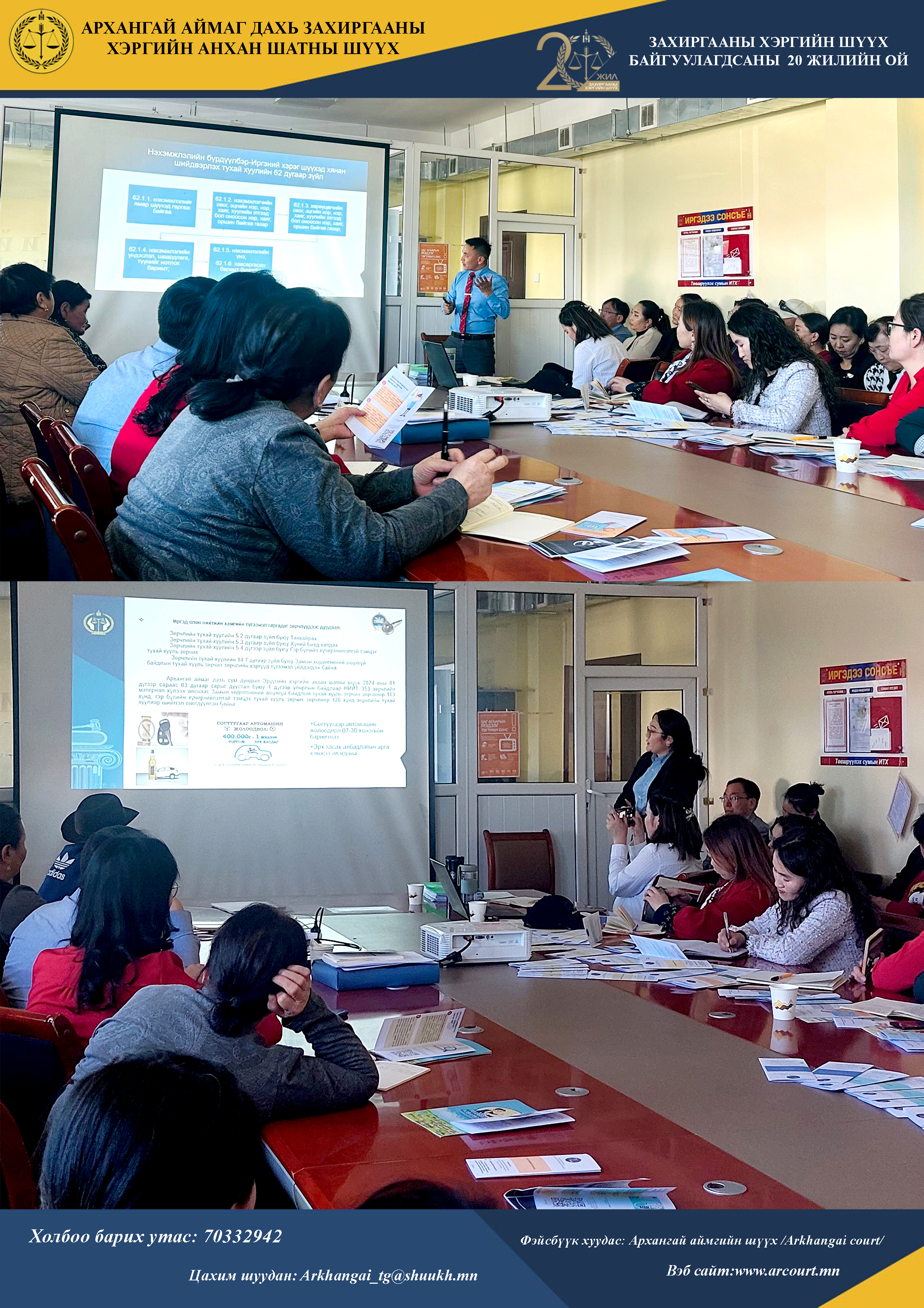 “Шүүх дэх эвлэрүүлэн зуучлалаар шийдвэрлэх маргаан, иргэдийн анхаарах асуудал” сэдвээр Архангай аймгийн шүүх дэх эвлэрүүлэн зуучлагч Т.Нэргүйбаатар нар тус тус сургалтыг эрхлэн хүргэж иргэдийн сонирхсон асуултад хариуллаа.