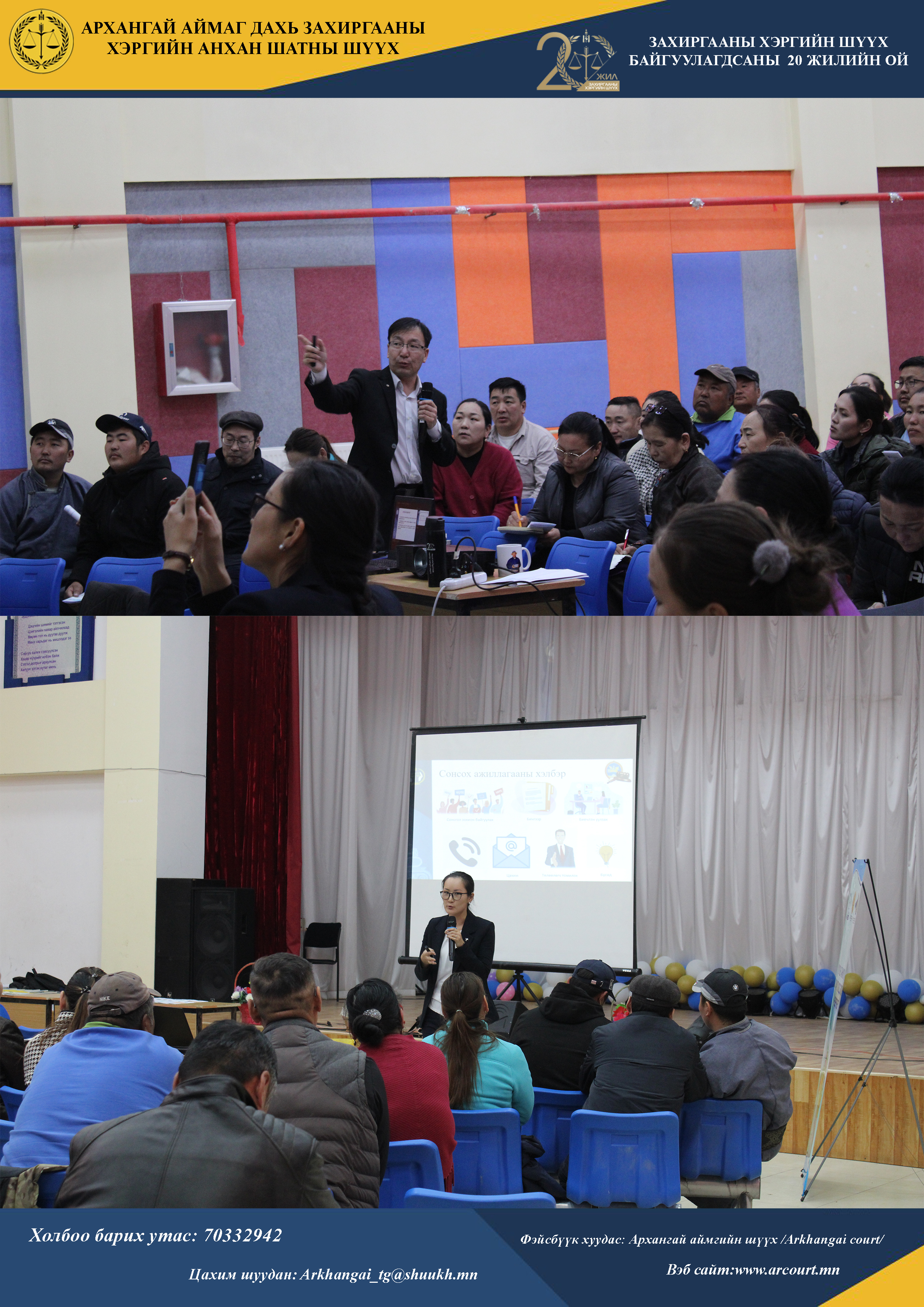 “Захиргааны байгууллагаас захиргааны шийдвэр гаргах ажиллагааг хэрэгжүүлж буй байдал, Захиргааных хэргийн шүүхэд нэхэмжлэл гаргахад анхаарах зарим асуудал” Архангай аймаг дахь Захиргааны хэргийн анхан шатны шүүхийн шүүгчийн туслах Г.Цэрэндэжид нар тус тус сургалтыг эрхлэн хүргэж иргэдийн сонирхсон асуултад хариуллаа.