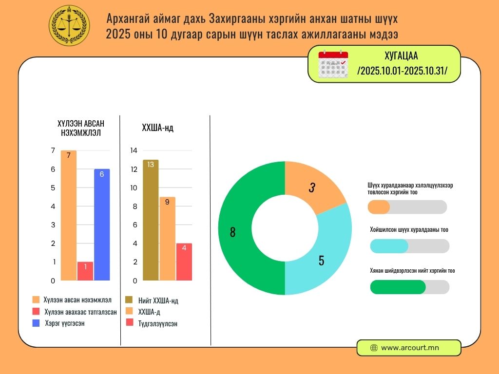 Архангай аймаг дахь Сум дундын анхан шатны шүүхийн 2025 оны 10 дугаар сарын шүүн таслах ажиллагааны мэдээ