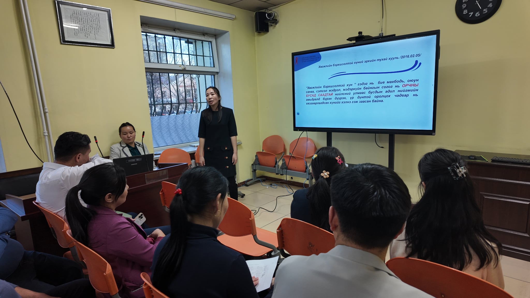 Нийгмийн оролцооны мэргэжилтэн Б.Насандулам “Хүртээмж ба дэд бүтэц” сэдвээр орж, барилга байгууламжийн хүртээмжийн сайжруулалт, стандартын шаардлагууд, байгууллагын орчны тохижилтын талаар мэдээлэл өглөө.
