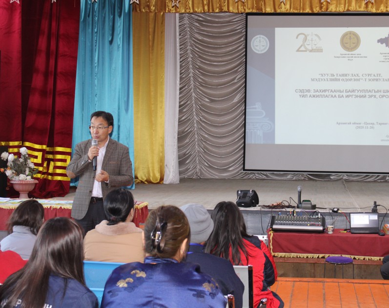 “Иргэний шүүхэд мэдүүлэх эрх, иргэний хэргийн шүүхээр түгээмэл шийдвэрлэгддэг хэрэг, маргаан анхаарах зүйл” сэдвийн хүрээнд Архангай аймаг дахь Захиргааны хэргийн анхан шатны шүүхийн Ерөнхий шүүгчийн туслах Э.Энххүү;