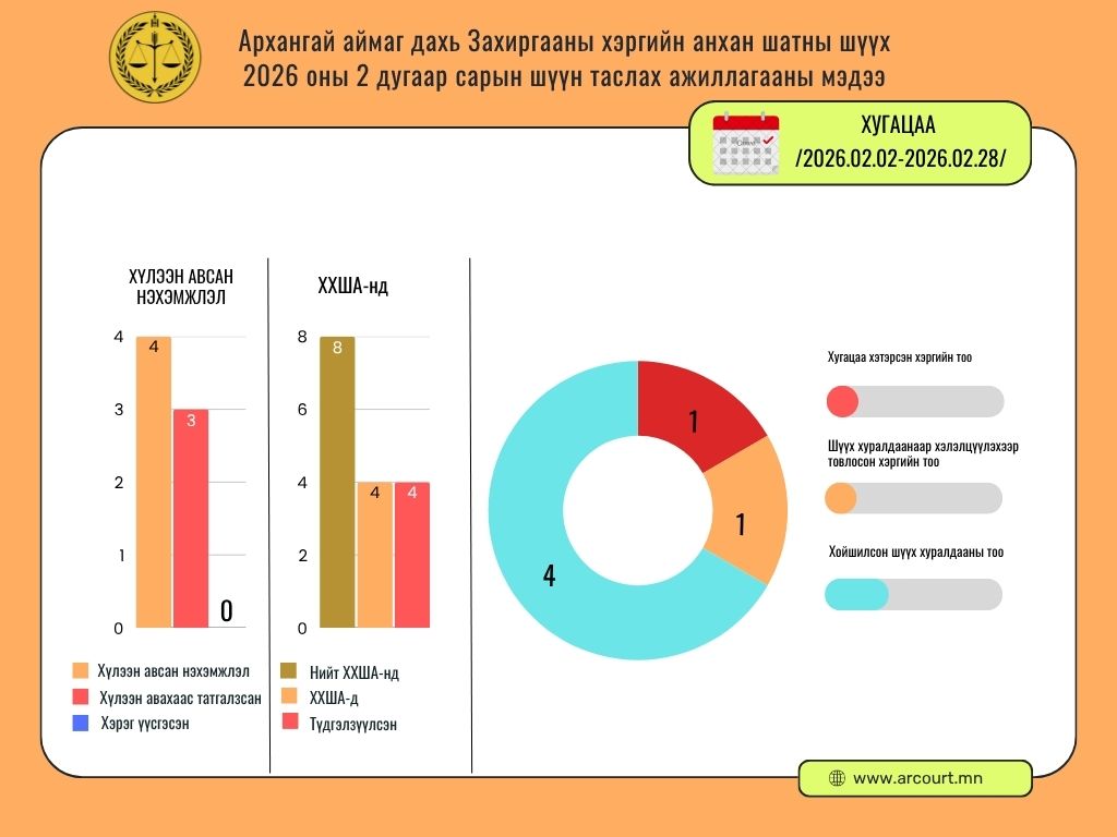 Архангай аймаг дахь Захиргааны хэргийн анхан шатны шүүхийн 2026 оны 2 дугаар сарын шүүн таслах ажиллагааны мэдээ