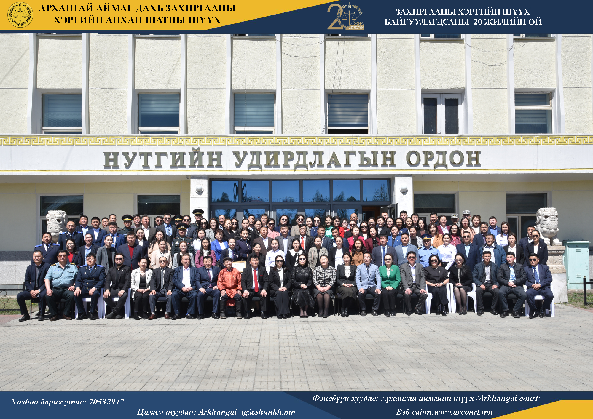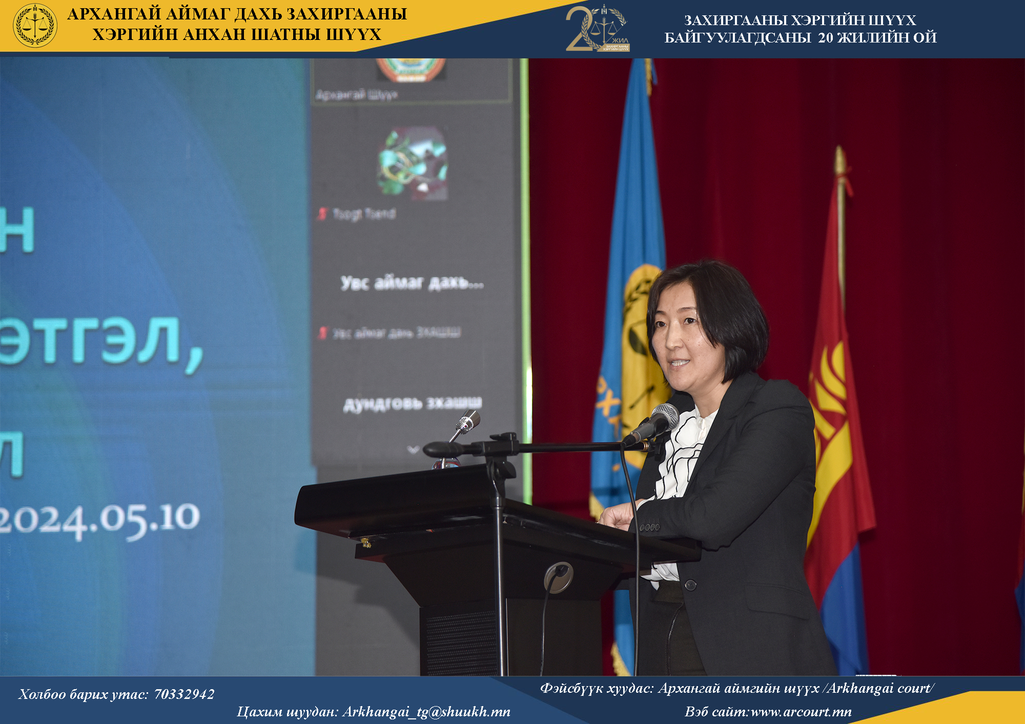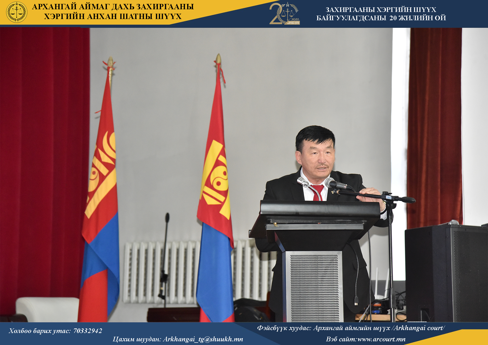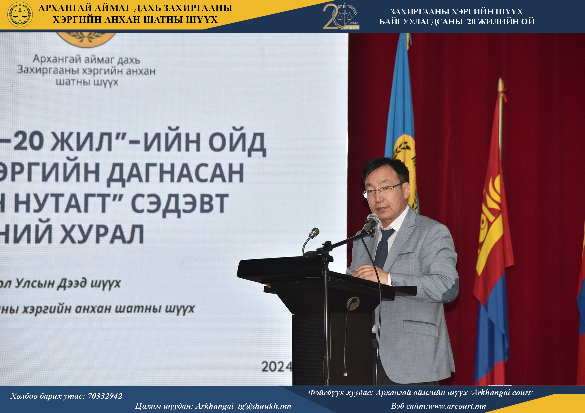 Монгол Усад Захиргааны хэргийн дагнасан шүүх байгуулагдсаны 20 жилийн хүрээнд "Захиргааны хэргийн дагнасан шүүхийн төлөвшил орон нутагт" сэдэвт хурлыг Архангай аймаг дахь Захиргааны хэргийн анхан шатны шүүхээс санаачлан Монгол Улсын дээд шүүх, Архангай аймгийн Засаг даргын Тамгын газрын дэмжлэг оролцоотойгоор хамтран 2024 оны 05 дугаар сарын 10-ны өдөр Архангай аймгийн Засаг даргын Тамгын газрын их танхимд зохион байгууллаа.