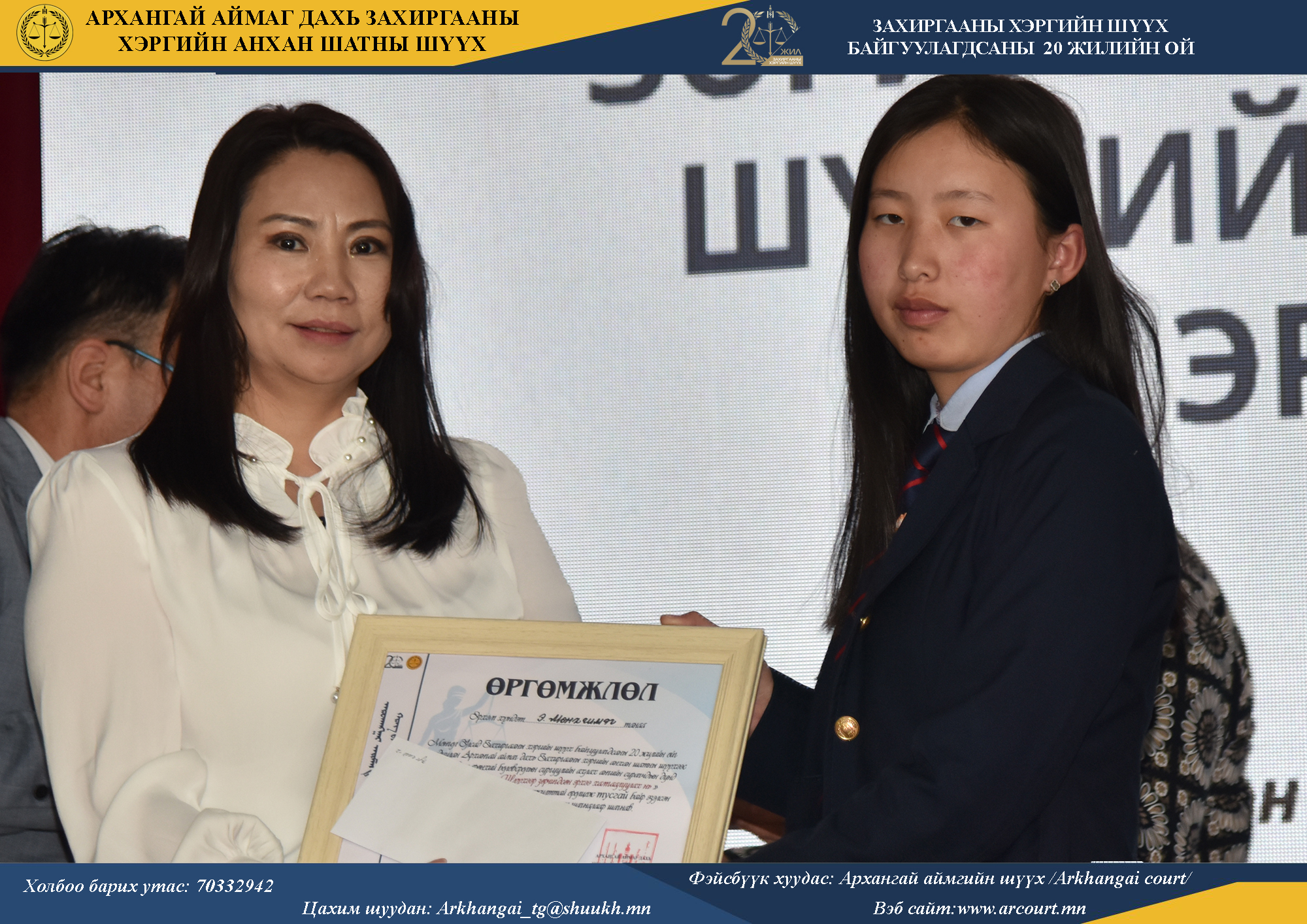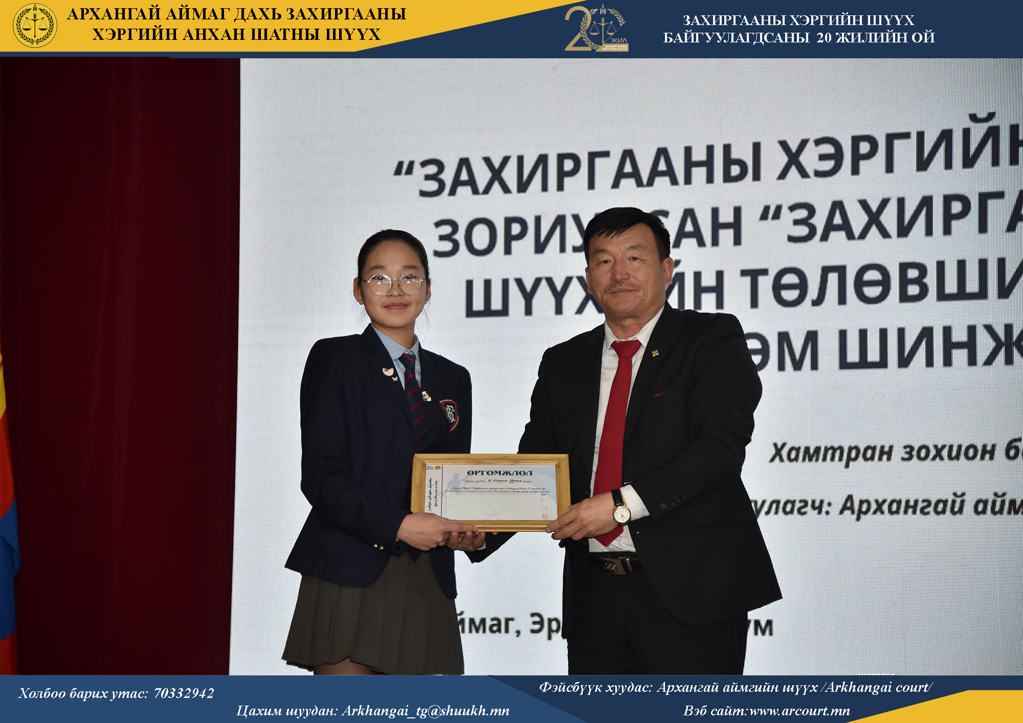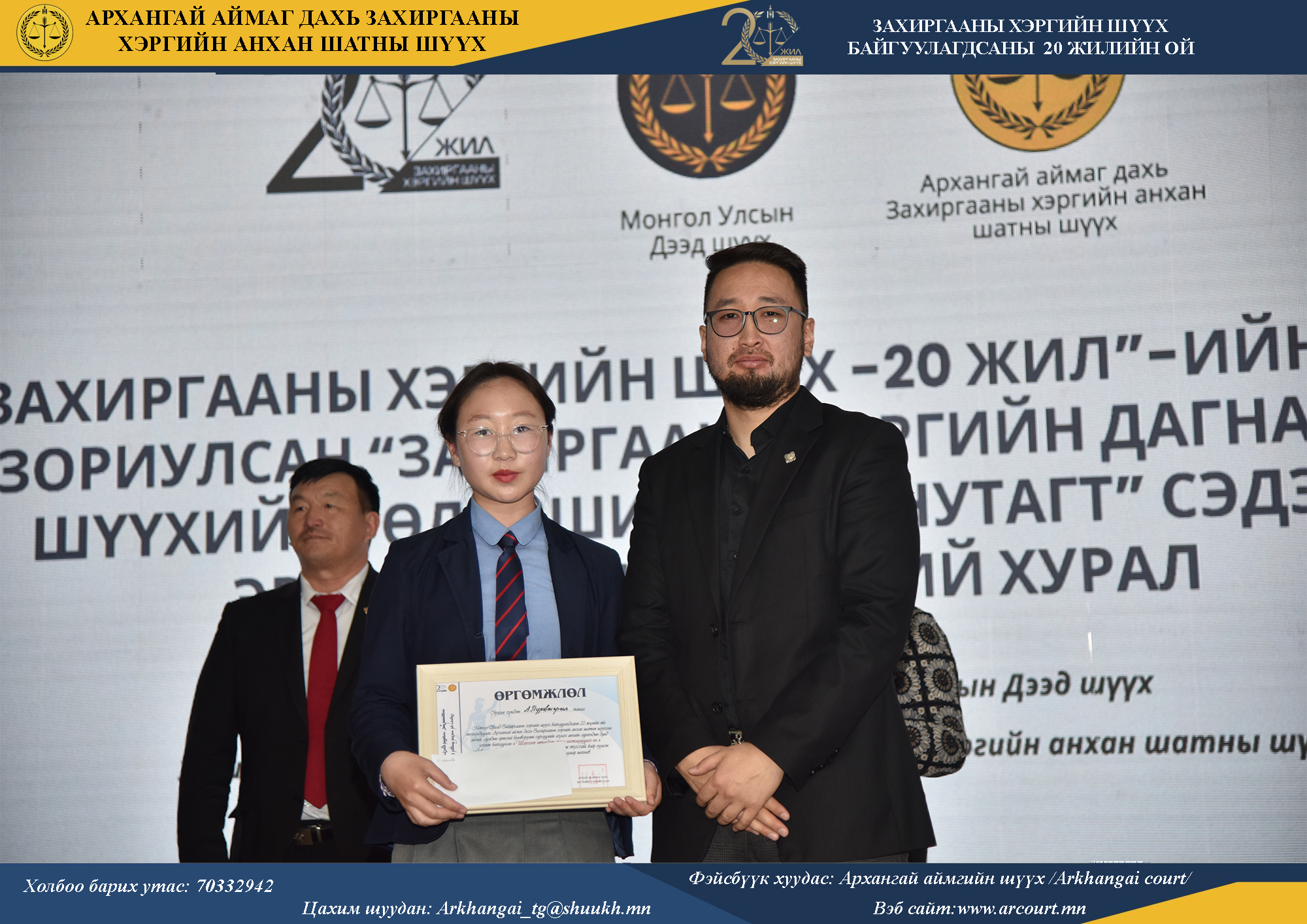 Түүнчлэн эрдэм шинжилгээний хурлын үеэр Архангай аймаг дахь Захиргааны хэргийн анхан шатны шүүхээс санаачлан Архангай аймгийн нийт ерөнхий боловсролын сургуулийн ахлах (9-12 дугаар) ангийн сурагчдын дунд зохион байгуулсан "Шүүхээр зөрчигдсөн эрхээ хамгаалуулах нь" сэдэвт эсээ бичлэгийн уралдаанд амжилттай оролцсон сурагчдад шагналыг гардуулж өглөө.