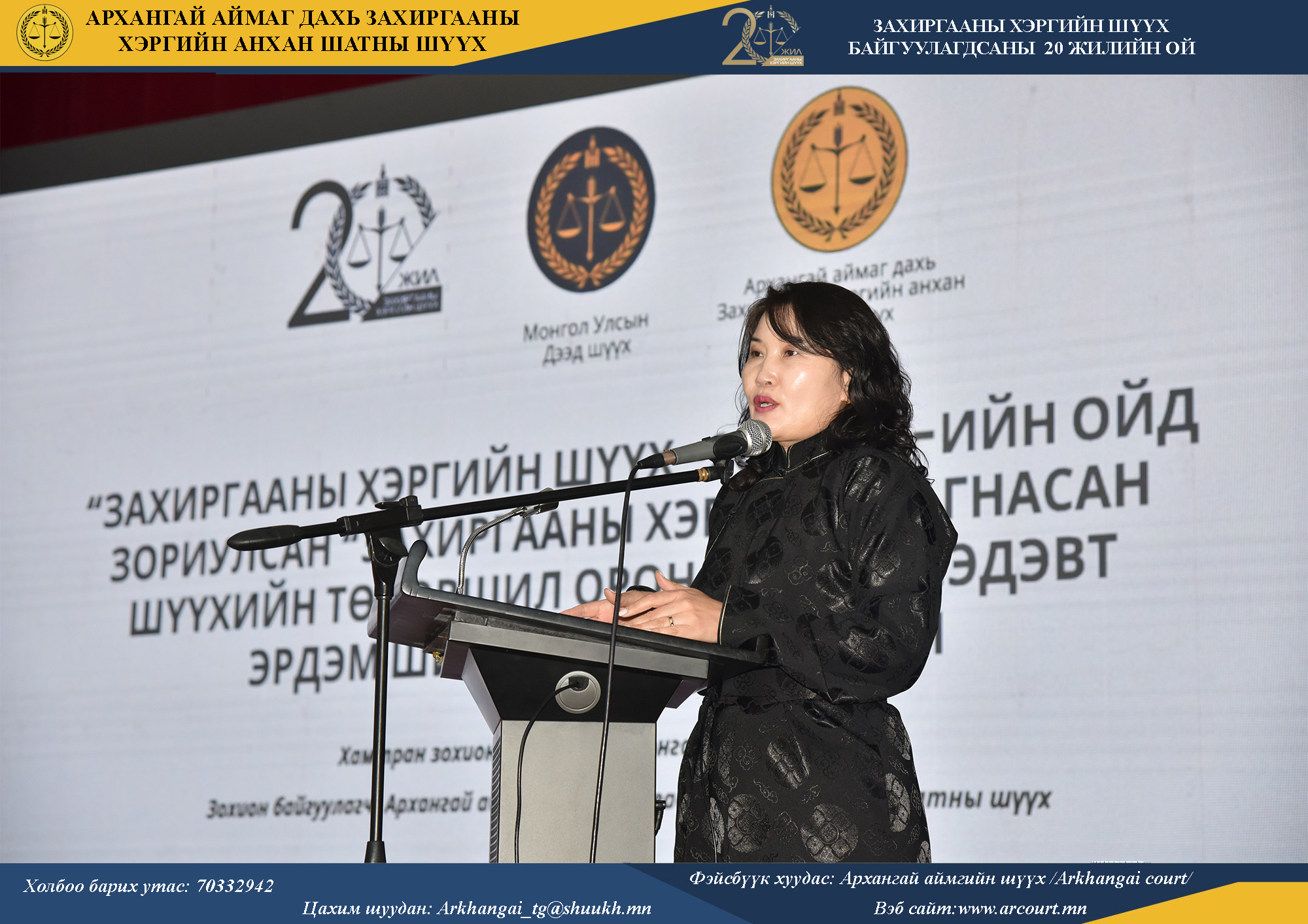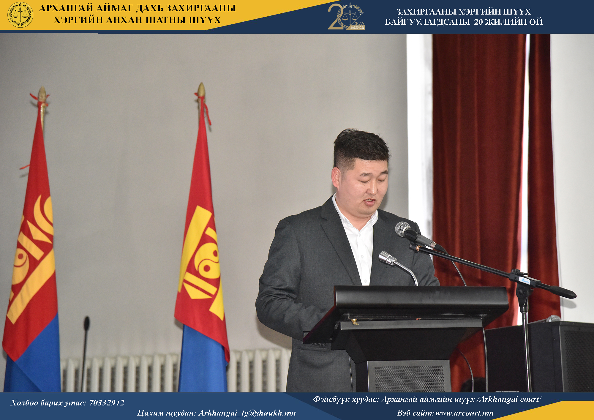 Мөн Монгол Улсын дээд шүүхийн Тамгын газрын дарга С.Заяадэлгэр, Архангай аймгийн Иргэдийн Төлөөлөгчдийн хурлын дарга Б.Батжаргал, Архангай аймгийн Засаг даргын орлогч Б.Санжмятав нар мэндчилгээ дэвшүүлж үг хэллээ.