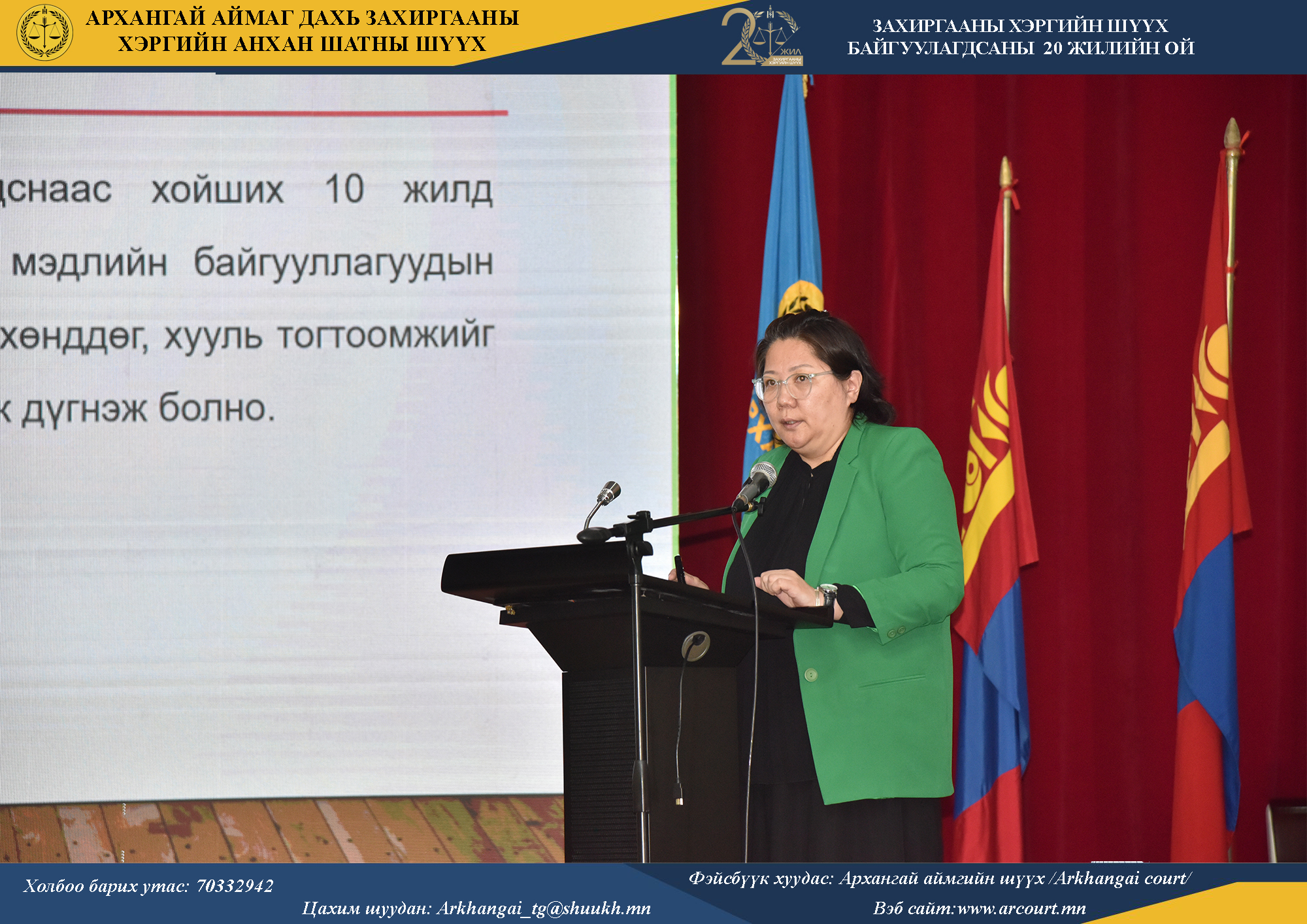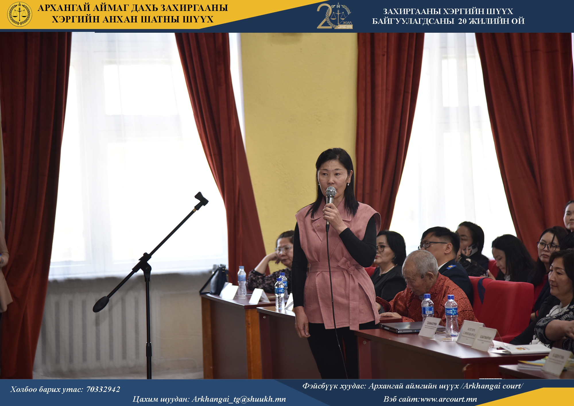 Эрдэм шинжилгээний хурлыг нээж Архангай аймаг дахь Захиргааны хэргийн анхан шатны шүүхийн Ерөнхий шүүгч Б.Одонтуяа үг хэлэв.