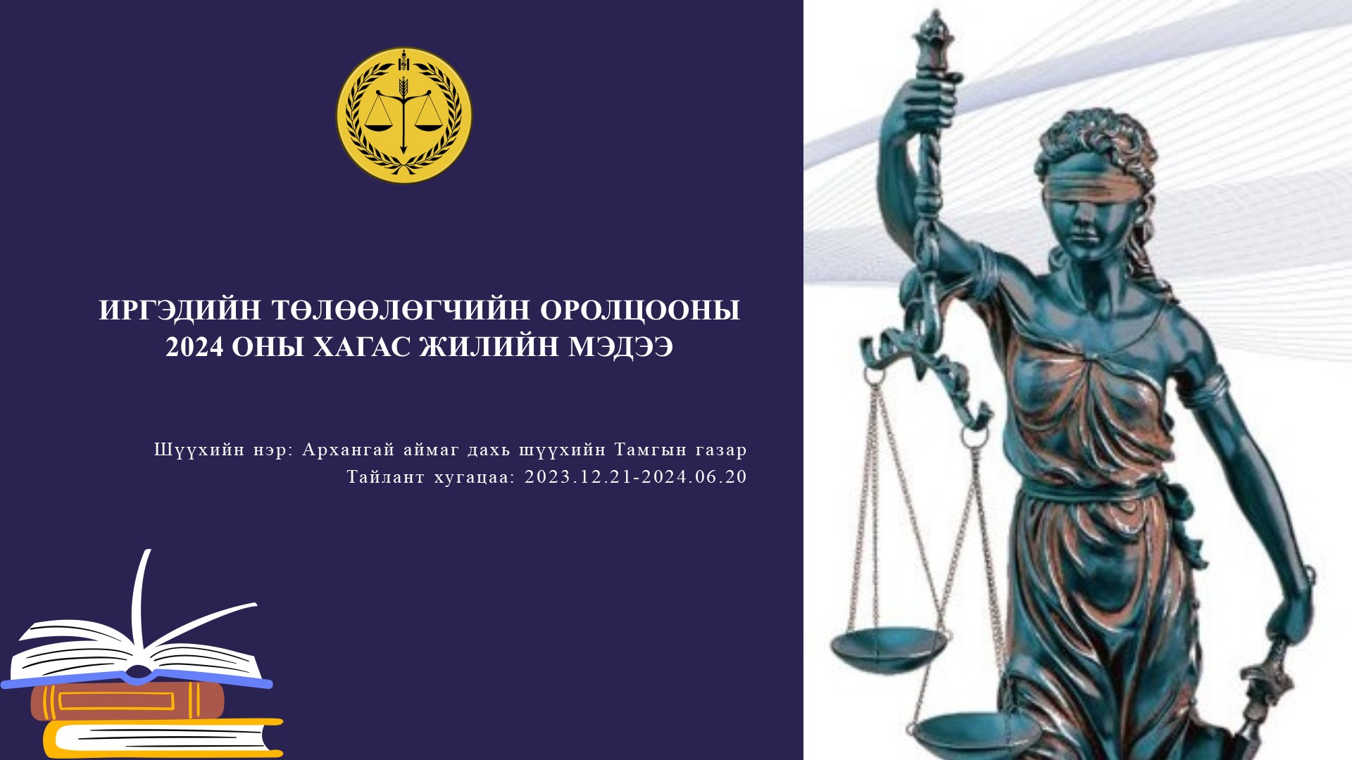АРХАНГАЙ АЙМАГ ДАХЬ ЗАХИРГААНЫ ХЭРГИЙН АНХАН ШАТНЫ ШҮҮХИЙН 2024 ОНЫ ХАГАС ЖИЛИЙН ХЭРЭГ ХЯНАН ШИЙДВЭРЛЭХ АЖИЛЛАГААНЫ МЭДЭЭЛЭЛ