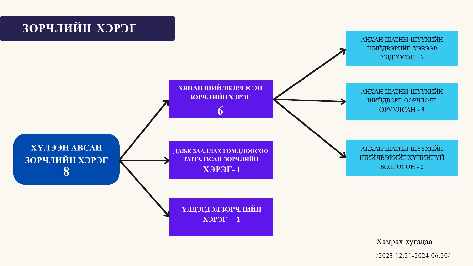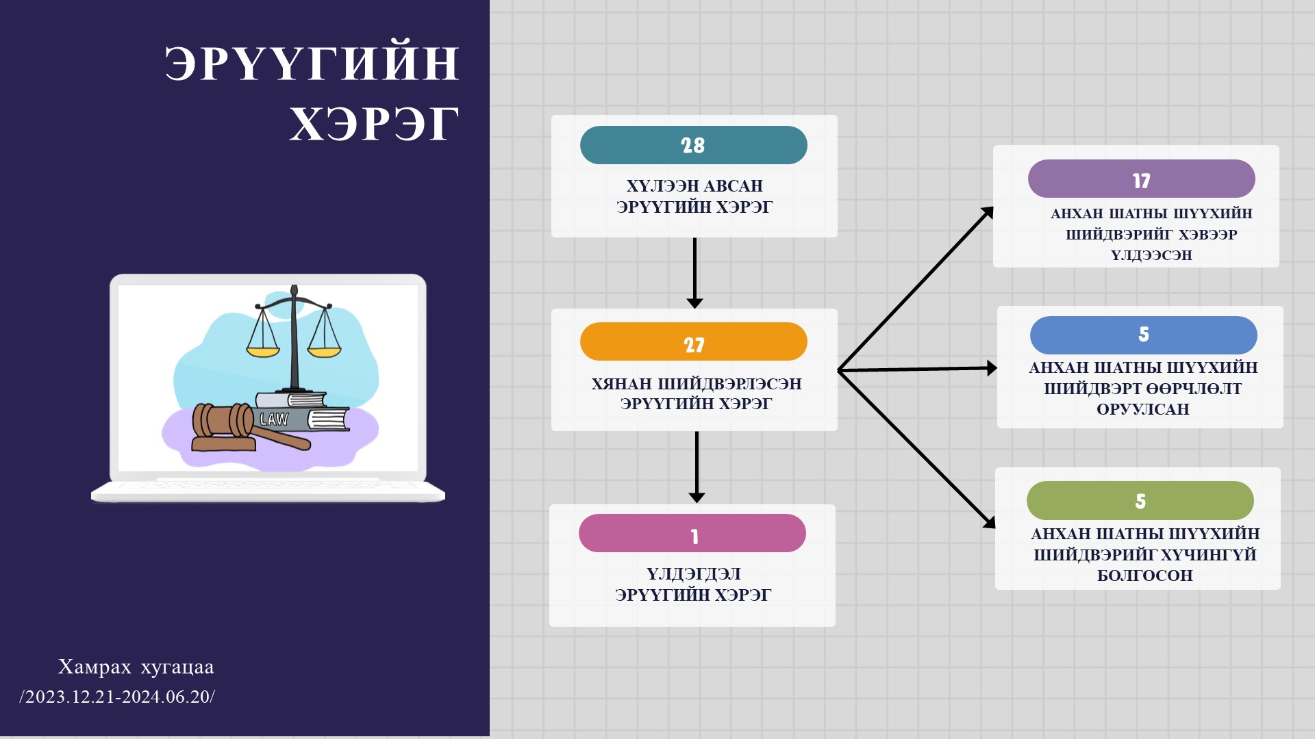 АРХАНГАЙ АЙМГИЙН ЭРҮҮ, ИРГЭНИЙ ХЭРГИЙН ДАВЖ ЗААЛДАХ ШАТНЫ ШҮҮХИЙН 2024 ОНЫ ХАГАС ЖИЛИЙН ХЭРЭГ ХЯНАН ШИЙДВЭРЛЭХ АЖИЛЛАГААНЫ МЭДЭЭЛЭЛ