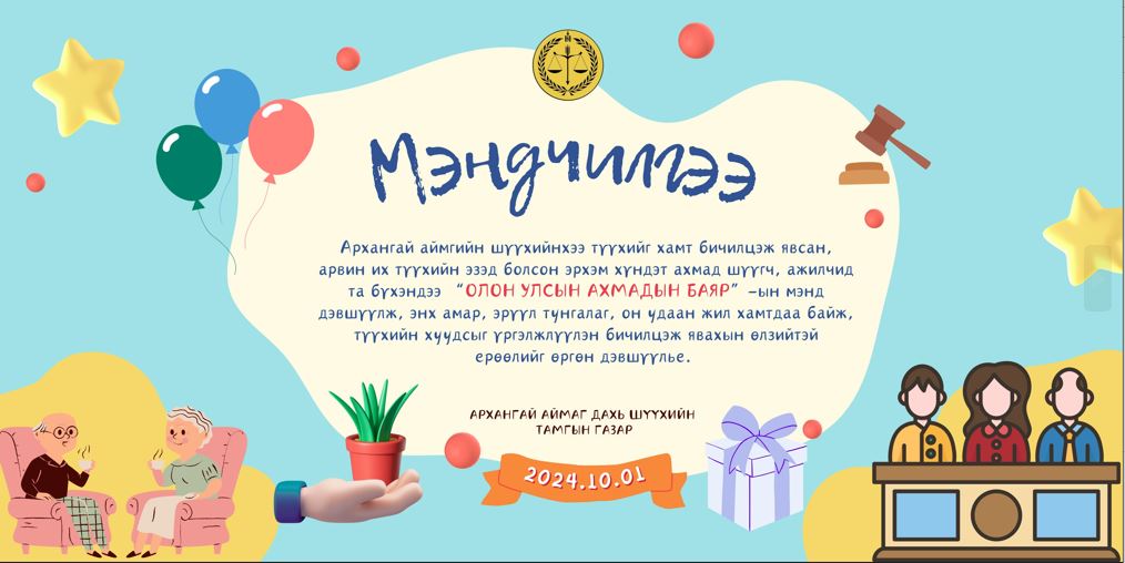2025-12-12 | 491Архангай аймгийн шүүхийнхээ түүхийг хамт бичилцэж явсан, арвин их түүхийн эзэд болсон эрхэм хүндэт ахмад шүүгч, ажилчид та бүхэндээ “ОЛОН УЛСЫН АХМАДЫН БАЯР”-ын мэнд дэвшүүлж, энх амар, эрүүл тунгалаг, он удаан жил хамтдаа байж, түүхийн хуудсыг үргэлжлүүлэн бичилцэж явахын өлзийтэй ерөөлийг өргөн дэвшүүлье.