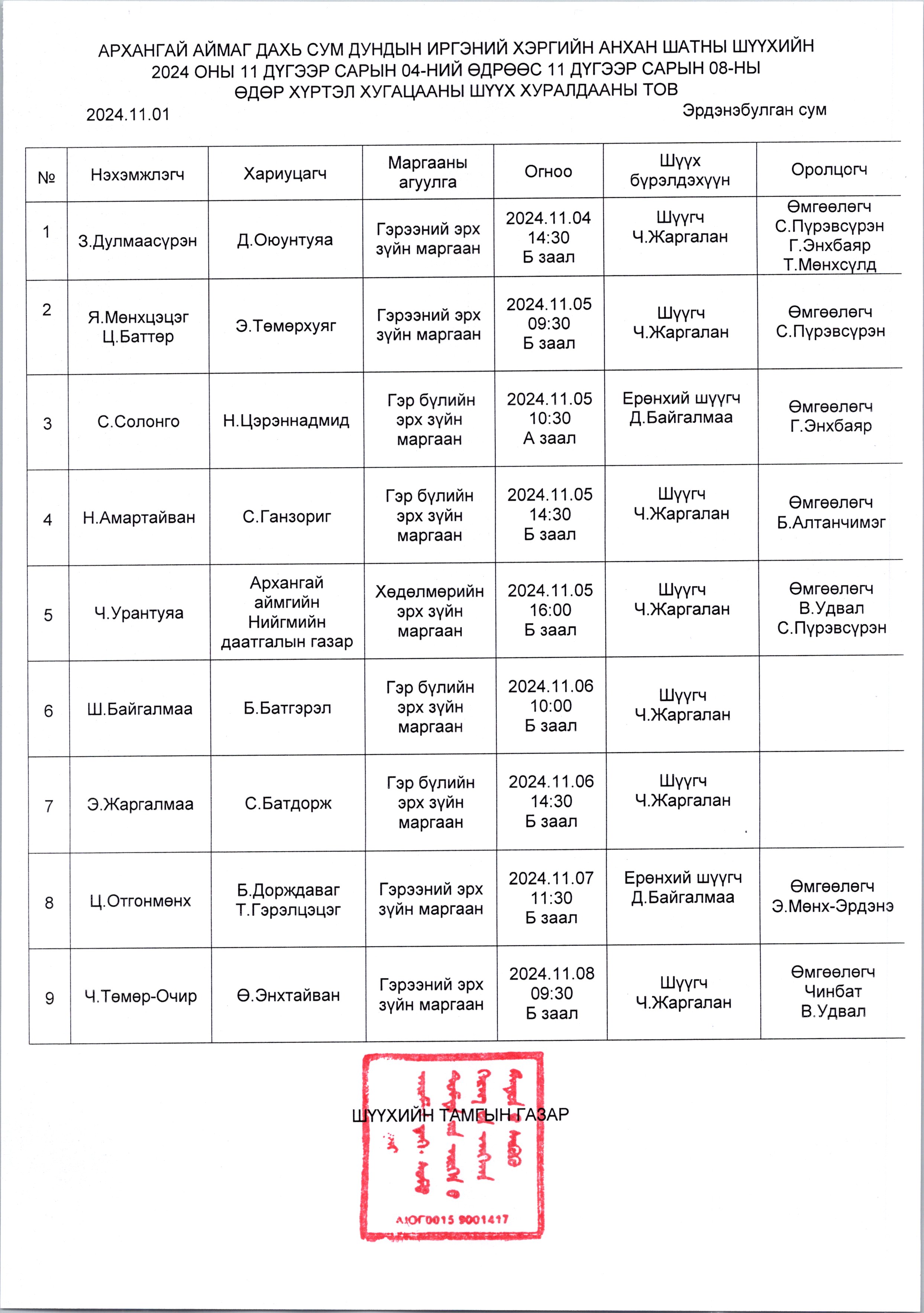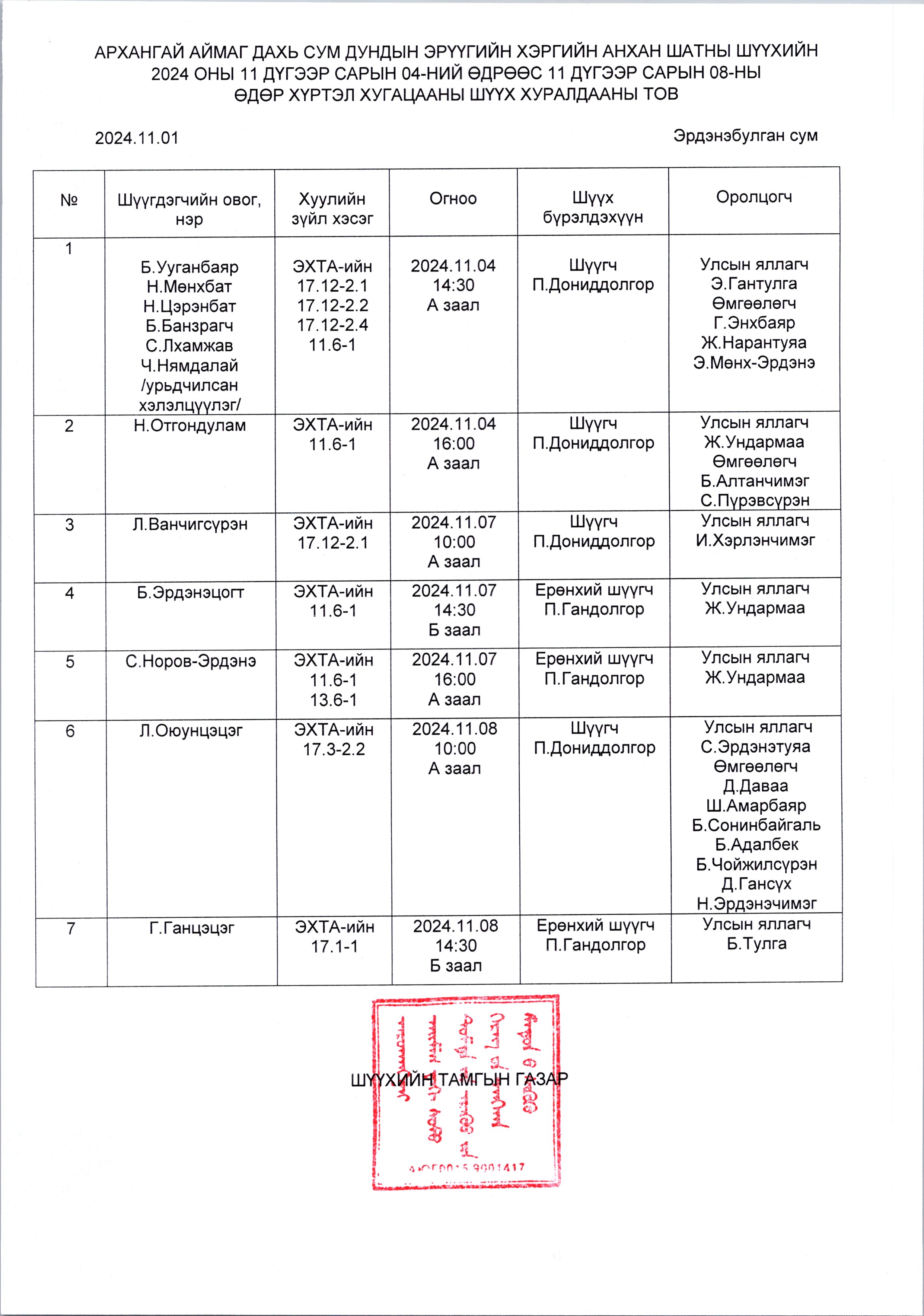 2024.10.28-2024.11.01 хүртэлх шүүх хуралдааны тов
