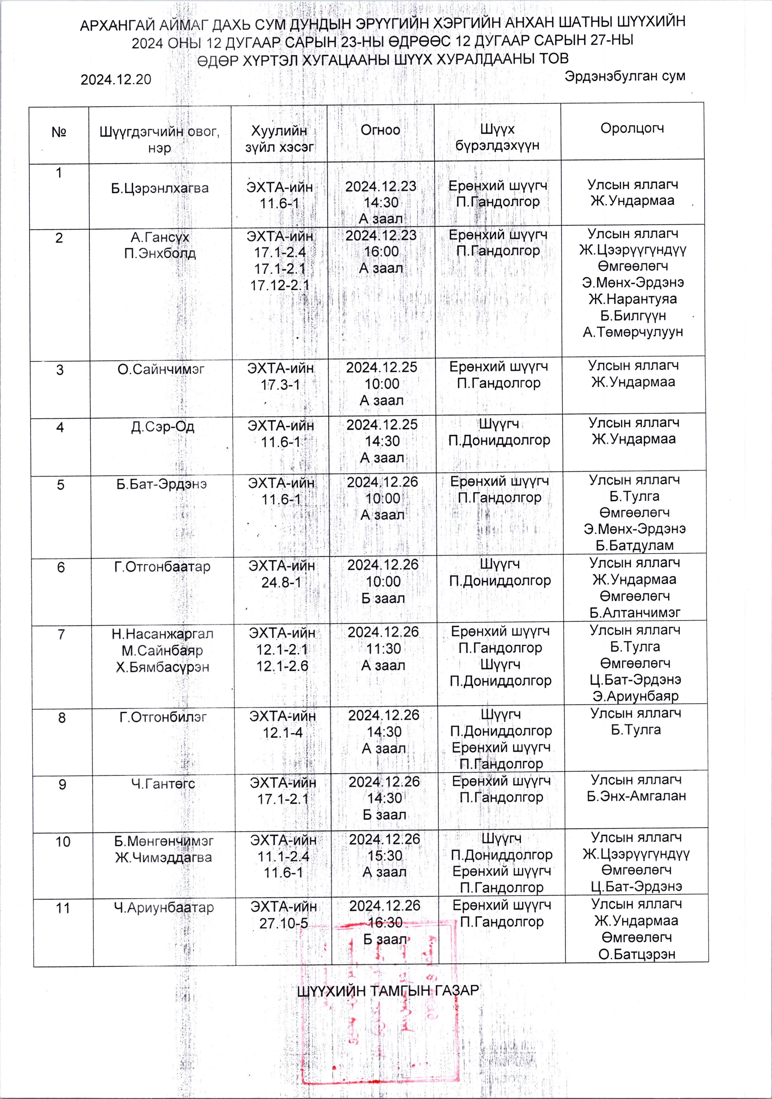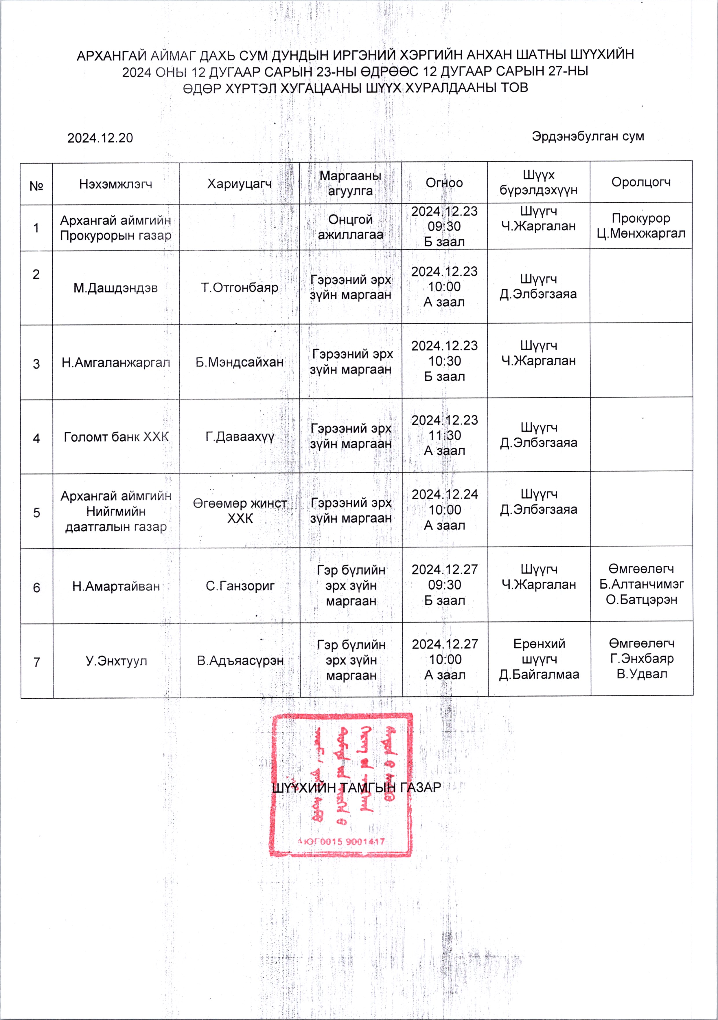2024.12.23-2024.12.27 хүртэлх шүүх хуралдааны тов