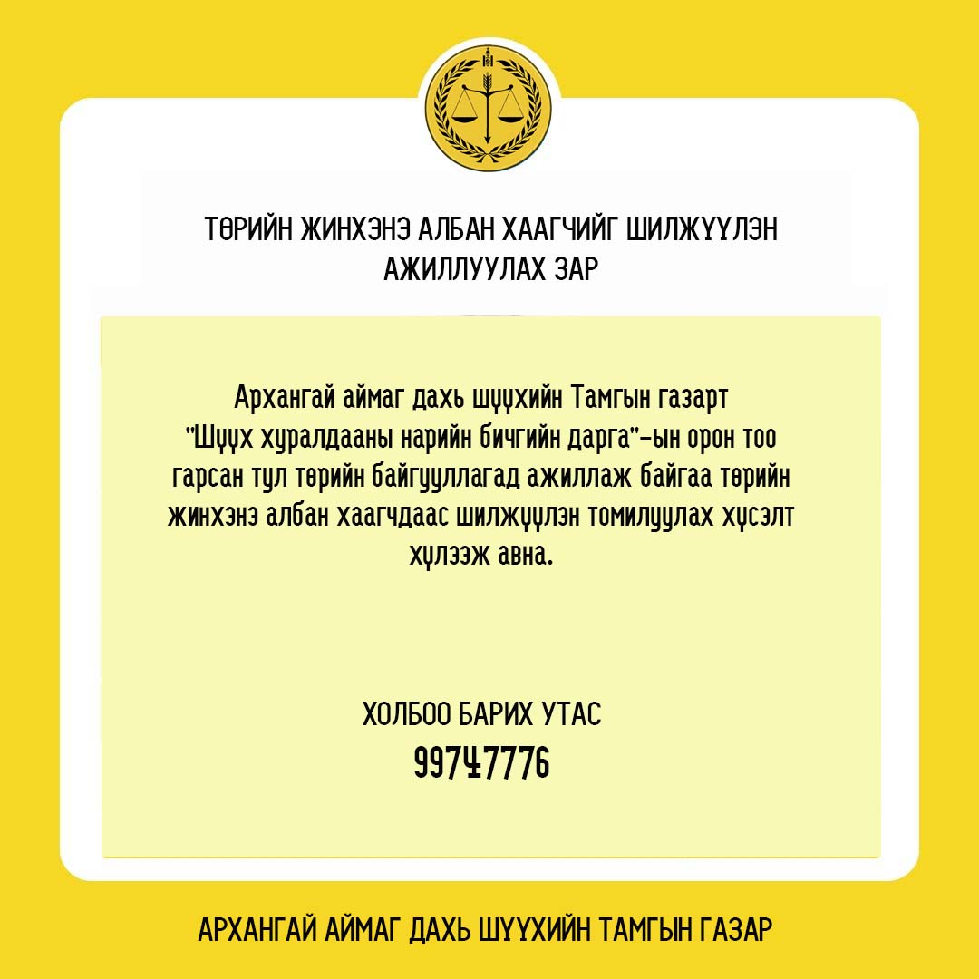 Архангай аймаг дахь шүүхийн Тамгын газарт "Шүүх хуралдааны нарийн бичгийн дарга"-ын орон тоо гарсан тул төрийн байгууллагад ажиллаж байгаа төрийн жинхэнэ албан хаагчдаас шлжүүлэн томилуулах хүсэлт хүлээж авна.