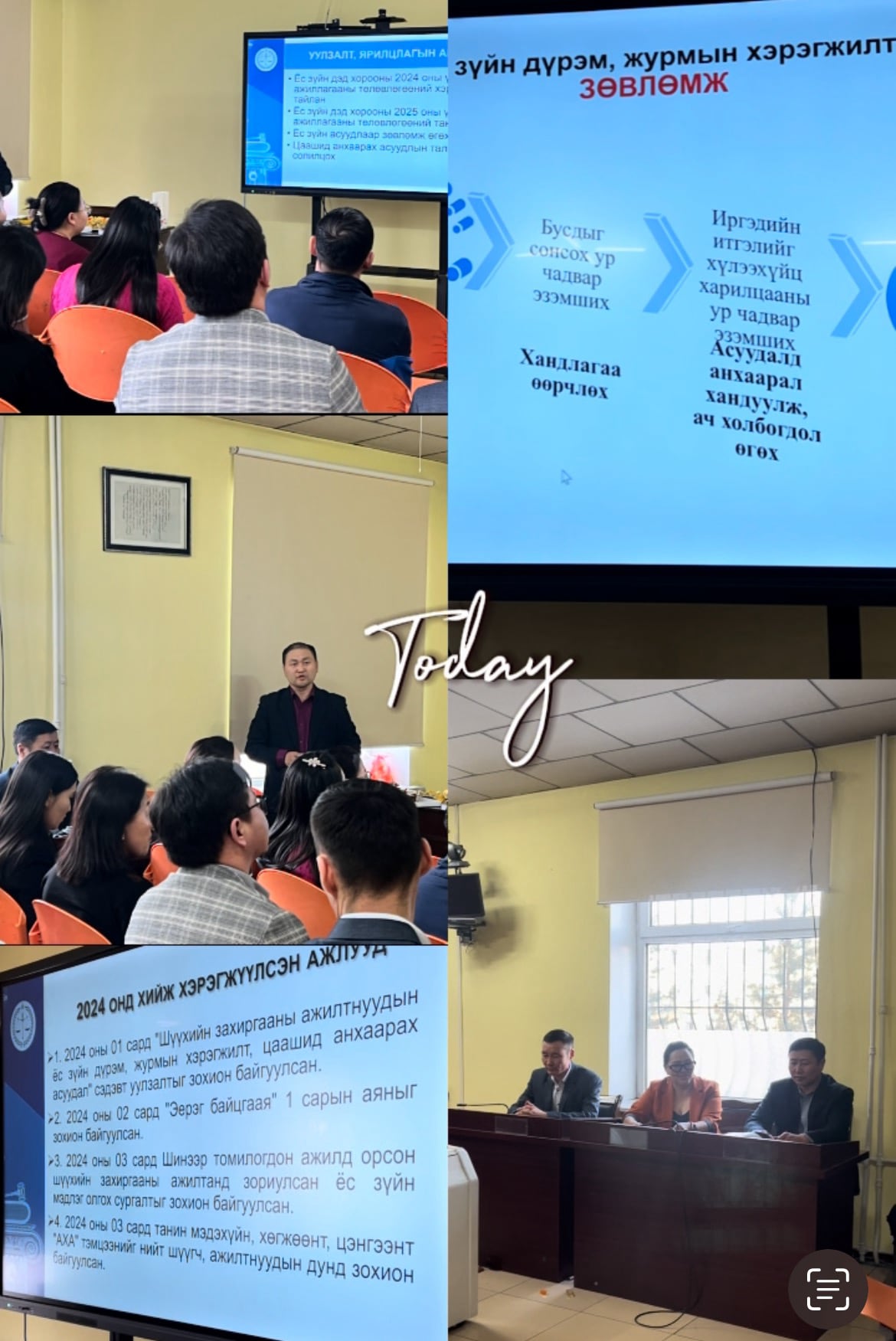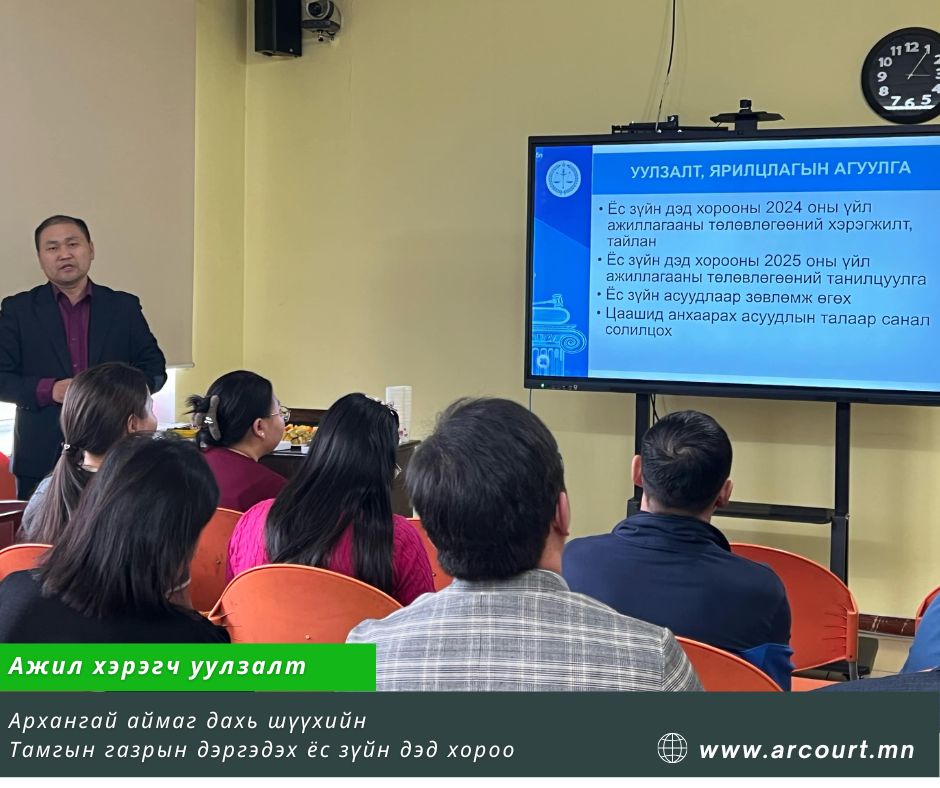 Уг уулзалтад Архангай аймаг дахь сум дундын анхан шатны шүүхийн Ерөнхий шүүгч Д.Байгалмаа уригдан оролцсон бөгөөд Төрийн албан хаагчийн ёс зүйн асуудлаар санал солилцож, харилцан ярилцсан үр дүнтэй уулзалт болж өндөрлөлөө.