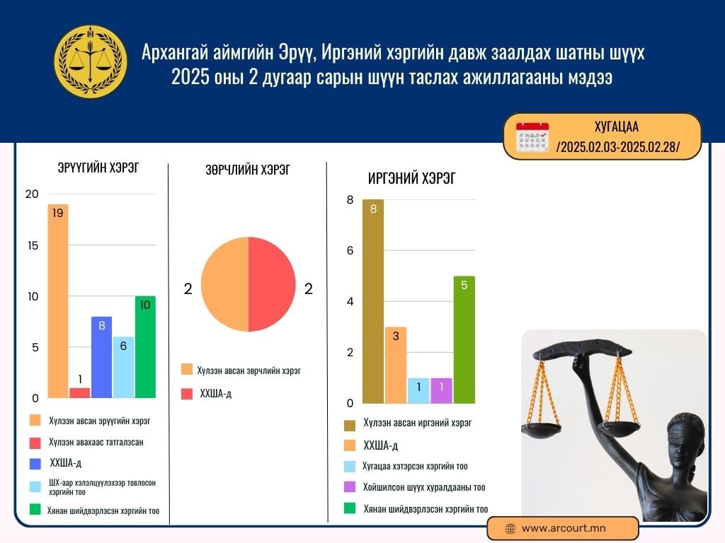 Архангай аймаг дахь Захиргааны хэргийн анхан шатны шүүхийн 2025 оны 2 дугаар сарын шүүн таслах ажиллагааны мэдээ