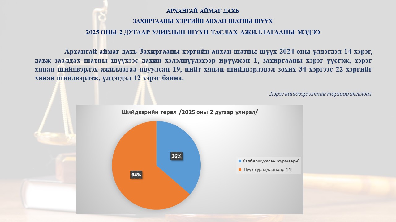 Архангай аймаг дахь Сум дундын анхан шатны шүүхийн 2025 оны 2 дугаар улирлын шүүн таслах ажиллагааны мэдээ