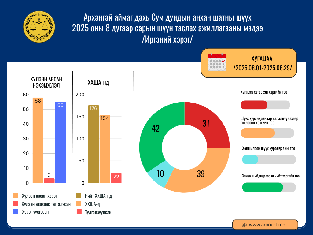 Архангай аймаг дахь Сум дундын анхан шатны шүүхийн 2025 оны 8 дугаар сарын шүүн таслах ажиллагааны мэдээ