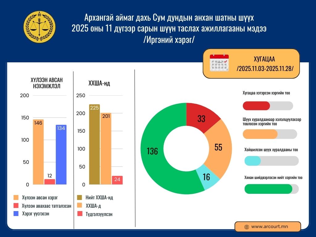Архангай аймаг дахь Сум дундын анхан шатны шүүхийн 2025 оны 11 дүгээр сарын шүүн таслах ажиллагааны мэдээ