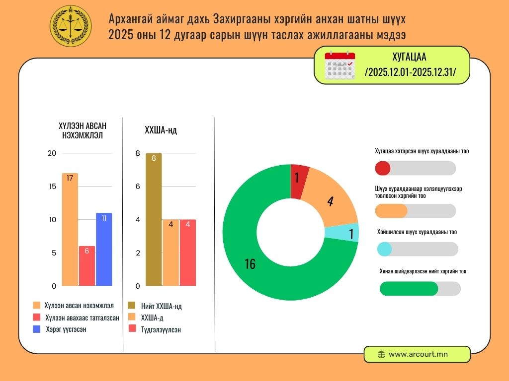Архангай аймаг дахь Сум дундын анхан шатны шүүхийн 2025 оны 12 дугаар сарын шүүн таслах ажиллагааны мэдээ